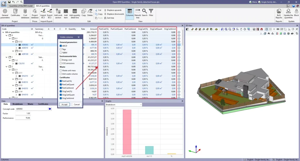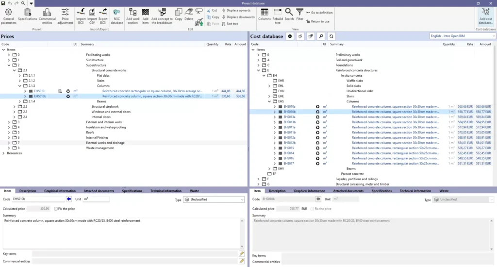 Baza e të dhënave të kostos mund të përcaktohet në skedën “Sasitë e Modelit BIM”, ku përdoruesit mund të shtojnë, krijojnë ose importojnë bazat e të dhënave të kostos në formatin FIEBDC-3.