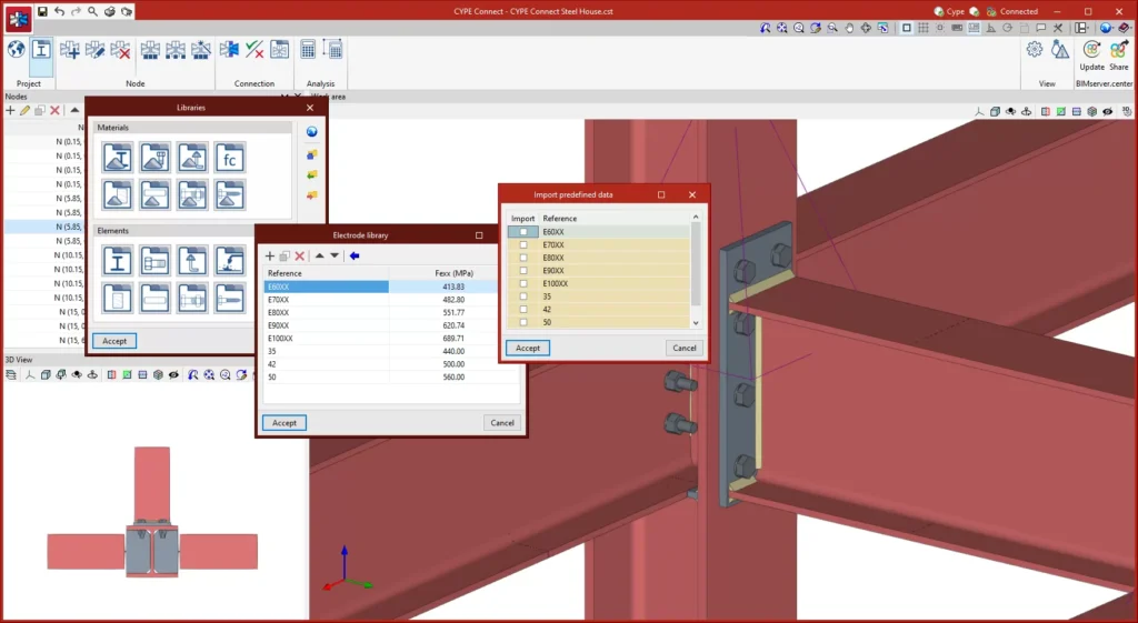 Ambienti i Punës dhe Proceset e Mbështetura nga Programi: CYPE Connect ofron një gamë të gjerë opsionesh të rrjedhës së punës si një mjet Open BIM dhe është i lidhur me platformën BIMserver.center. Krijimi, analiza dhe informacioni grafik i lidhjeve individuale kryhen plotësisht brenda vetë programit. Programi gjithashtu mbështet importimin e modeleve të strukturave të çelikut të analizuara më parë në CYPE 3D ose CYPECAD, si dhe importimin e modeleve strukturale të çelikut në formatin IFC përmes IFC Uploader.