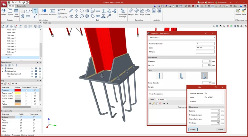 Biblioteka e Elementëve: StruBIM Steel gjithashtu lejon ruajtjen e karakteristikave të elementëve të projektit përmes bibliotekave të ndryshme, duke përfshirë bibliotekën e seksioneve të çelikut dhe bibliotekën e bullonave.